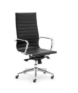 Poltrona direzionale, in finta pelle nera, braccioli e base in acciaio cromato